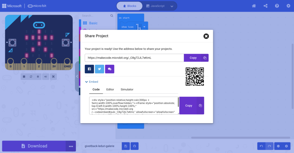 Putem încorpora proiectul într-o altă pagină web, astfel încât vizitatorii să poată utiliza simulatorul, să editeze codul sau să descarce proiectul fără a fi nevoie să părăsească site-ul (se copiază codul HTML și se duce în pagina web).