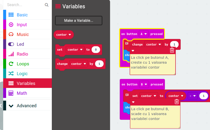 Variabilele sunt ca niște sertare în care micro:bitul păstrează/stochează date pentru a le putea folosi mai târziu.