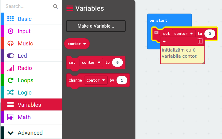 Modificarea unei variabile se va face folosind blocul change sau blocul set. Dacă alegem blocul set, vom avea nevoie de operatorii din Math.