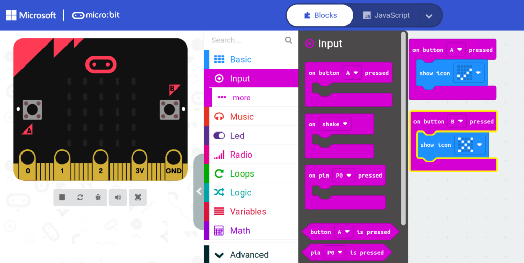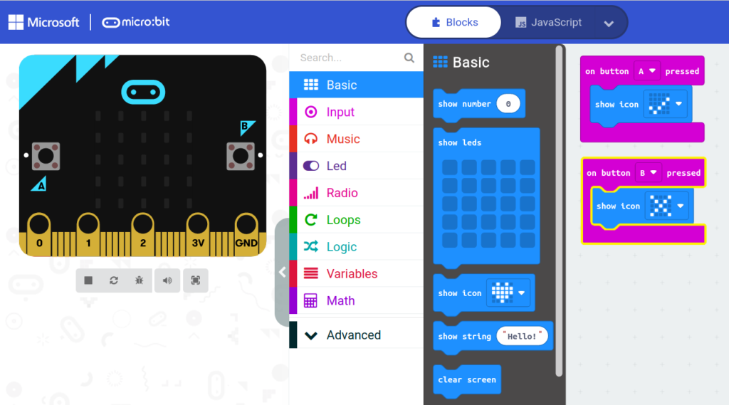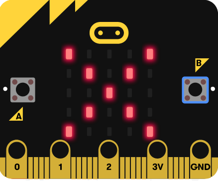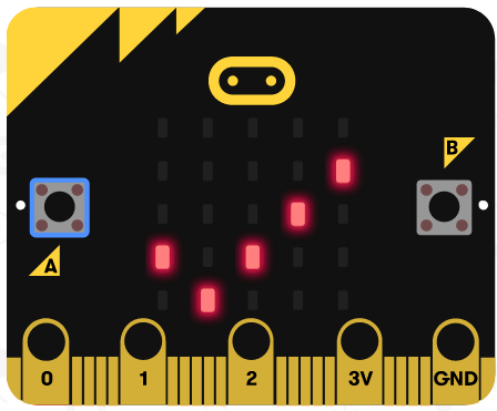 Vom crea două imagini simple din puncte. Dacă apăsăm butonul A, vom vedea pe ecranul de LED-uri prima imagine. Dacă apăsăm butonul B, vom vedea cea de-a doua imagine.