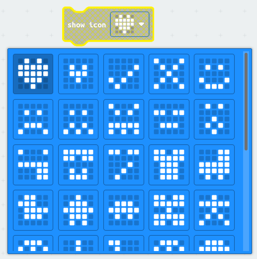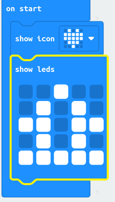 Blocul Show Icon conține o listă de imagini create din puncte din care putem alege. Pentru a ne crea propriile imagini, putem folosi blocul Show leds – dăm click pe punctele/LED-urile care vrem să fie aprinse.
