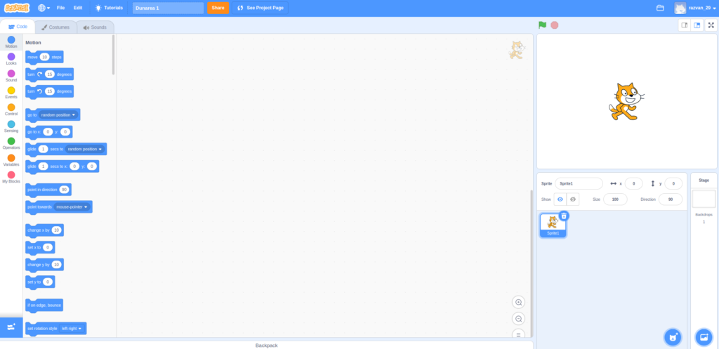 Creăm un nou proiect în Scratch și îl denumim “Dunarea 1“