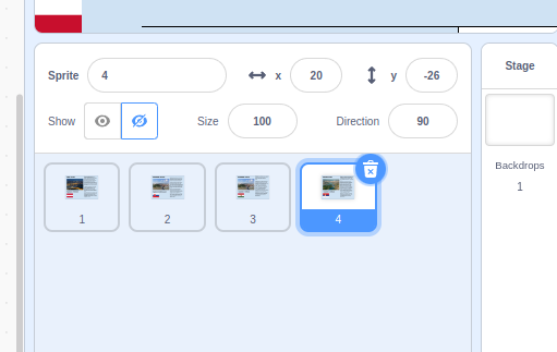 Vom selecta fiecare fișă din zona de personaje (sprite) și vom folosi butonul Arată/Show pentru a le ascunde din fereastra de previzualizare.