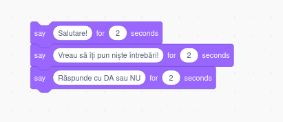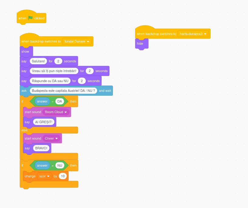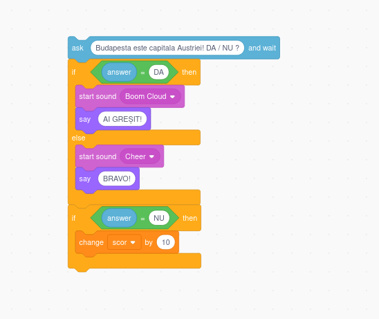 Cu blocul ask vom pune întrebări utilizatorului iar apoi cu blocul condițional IF – ELSE vom adăuga sunete dedicate pentru răspunsul corect și pentru cel greșit și de asemenea vom actualiza scorul cu 10 puncte pentru fiecare întrebare la care s-a răspuns corect.