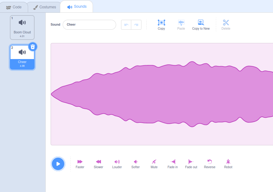 Vom alege 2 sunete pentru personajul Abby din biblioteca integrată de sunete. Boom Cloud și Cheer. Boom Cloud îl vom folosi pentru răspunsul incorect și Cheer pentru răspunsul corect.