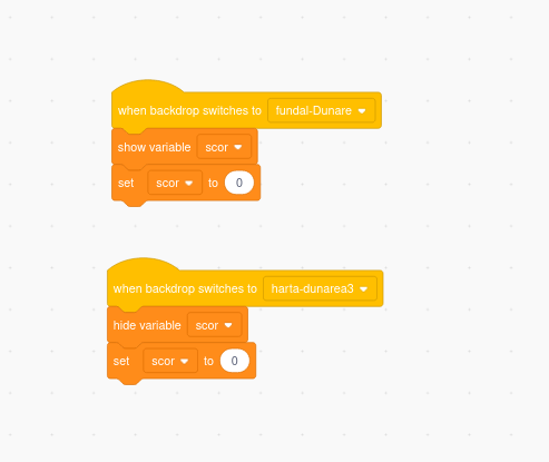 Prima parte a codului va arăta grafic variabila scor atunci când fundalul este cel de al doilea iar cealaltă parte a codului va ascunde variabila scor atunci când fundalul principal este selectat. Ambele coduri vor reseta variabila scor la 0.