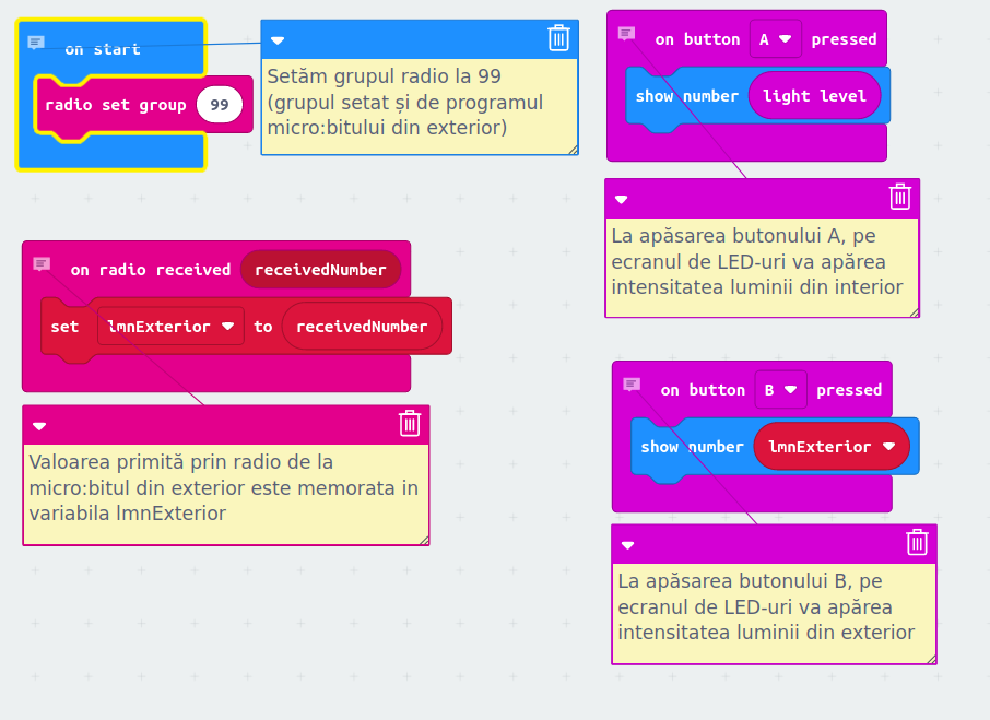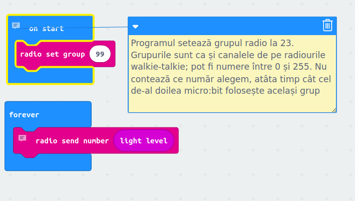 Micro:bitul din interior va prelua valoarea transmisă prin radio de primul micro:bit și o va memora într-o variabilă. Pentru ca acest lucru să fie posibil, cei doi micro:biți vor fi în același grup.