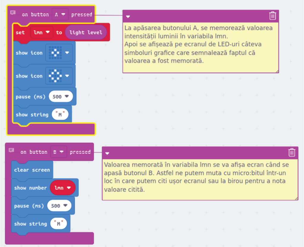 Vom veni cu micro:bitul într-un loc în care putem citi ușor ecranul de LED-uri. Vom apăsa butonul B și vom vedea cât este intensitatea luminii măsurată la pasul anterior – va fi un număr între 0 (întuneric) și 255 (cea mai mare intensitate a luminii pe care o poate măsura micro:bitul).